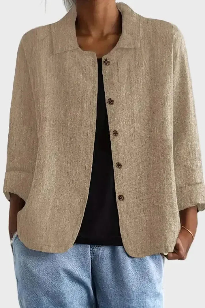 Tento stylový lněný kabát v teplém růžovém odstínu spojuje pohodlí a styl – ideální jak pro každodenní nošení, tak pro upravenější příležitosti. Lehká tkanina a volný střih z něj činí snadno nositelný kousek ve všech ročních obdobích.