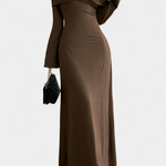 • Pevně přiléhavá silueta kombinovaná s dlouhou, splývavou sukní vytváří nadčasový, štíhlý pohyb.