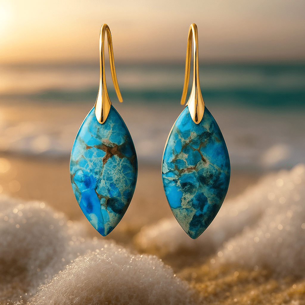 Náušnice Avelina zachycují kouzlo pláže Elafonissi na Krétě, kde moře mění barvu na zelenou. Hřejivá tyrkysová barva, kterou oživují zlaté a pískové pruhy, odráží krystalově čistou vodu, která se dotýká růžové pláže. Tyto kameny přinášejí každému stylu světlo a hloubku.