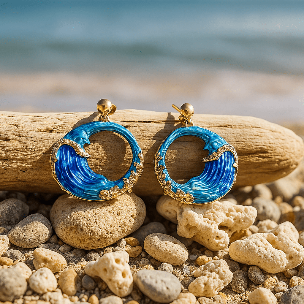 Objevte náušnice Nereida, které zachycují pohyb moře do dokonalého kruhu. Každá vlna je ručně vyřezávaná a malovaná v hlubokých modrých odstínech a zlatých detailech, které připomínají třpytění mořské pěny.