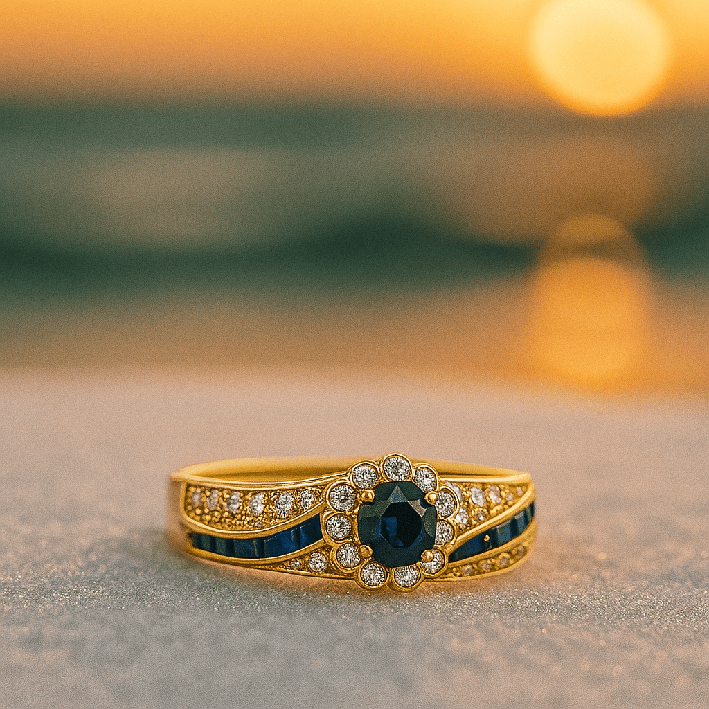 Zažijte kouzlo prstenu Fior di Mare, inspirovaného květinou, která rozkvétá ve své nádheře na slunečním světle a je obklopena jemnými vlnami. Hluboce modré středové kameny připomínají hloubku moře a třpytivá korunka tančí ve světle – tento prsten ztělesňuje ženskost s námořní elegancí.