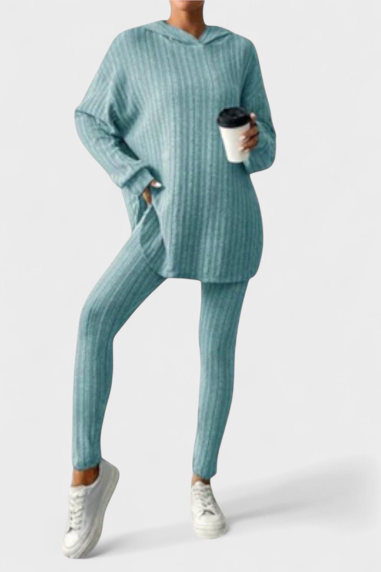 Tento set vyrobený z ribbového úpletu je ideální volbou pro ty, kteří hledají praktičnost se špetkou elegance. Přizpůsobený střih a prodloužená délka trička vytvářejí moderní vzhled, který se dokonale hodí domů, do práce nebo na neformální výlet.