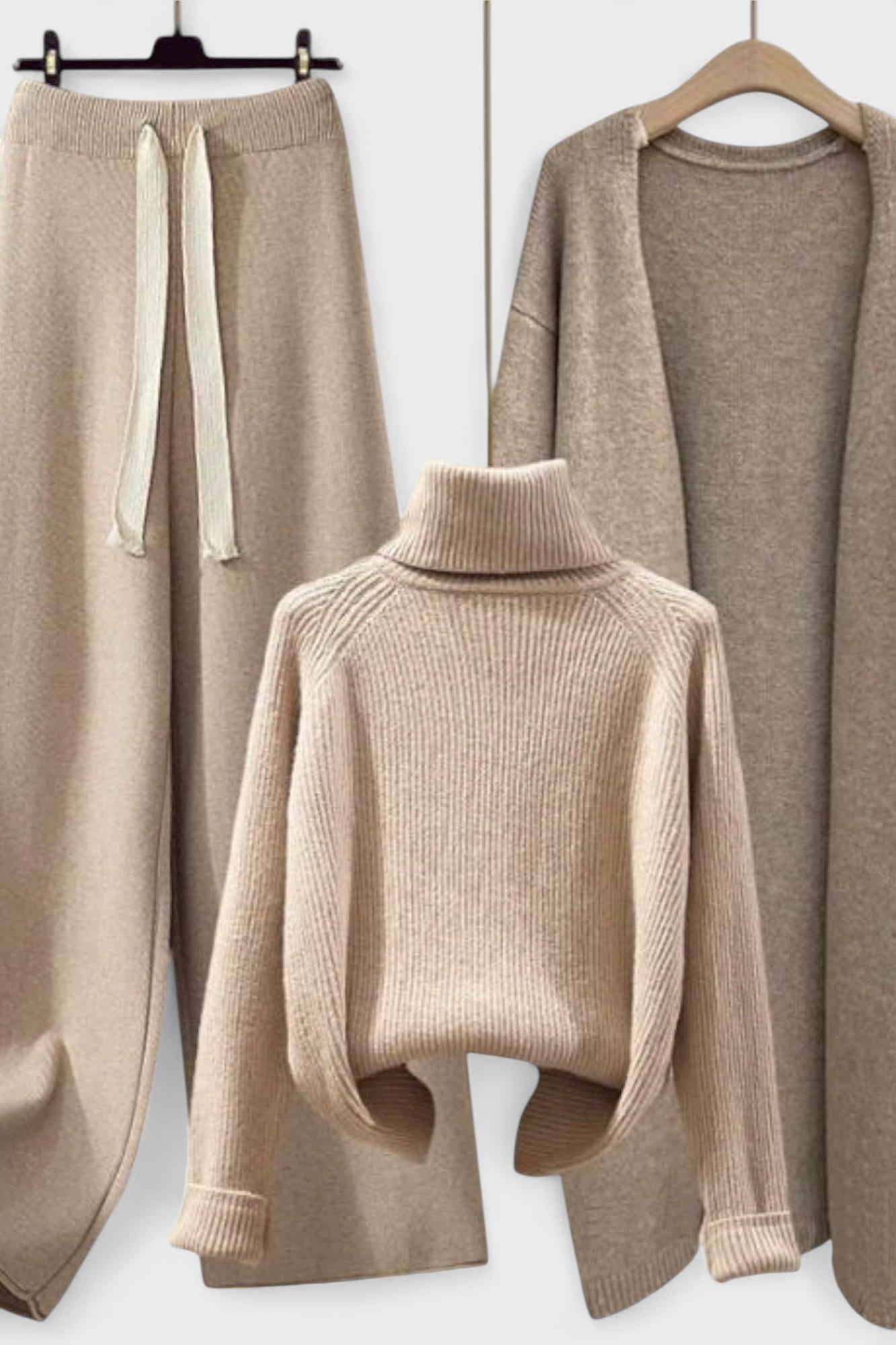 Tento pletený set je definicí elegantního pohodlí. Set obsahuje kalhoty s širokými nohavicemi a nastavitelným pasem, vysoký rolák a dlouhý kabát – ideální na chladnější dny, aniž byste museli slevit ze stylu. Měkký materiál a dokonalé padnutí vytvářejí sofistikovaný vzhled, který se skvěle hodí domů, do kanceláře nebo na výlety, přinášející pohodlí a šarm do každé situace.