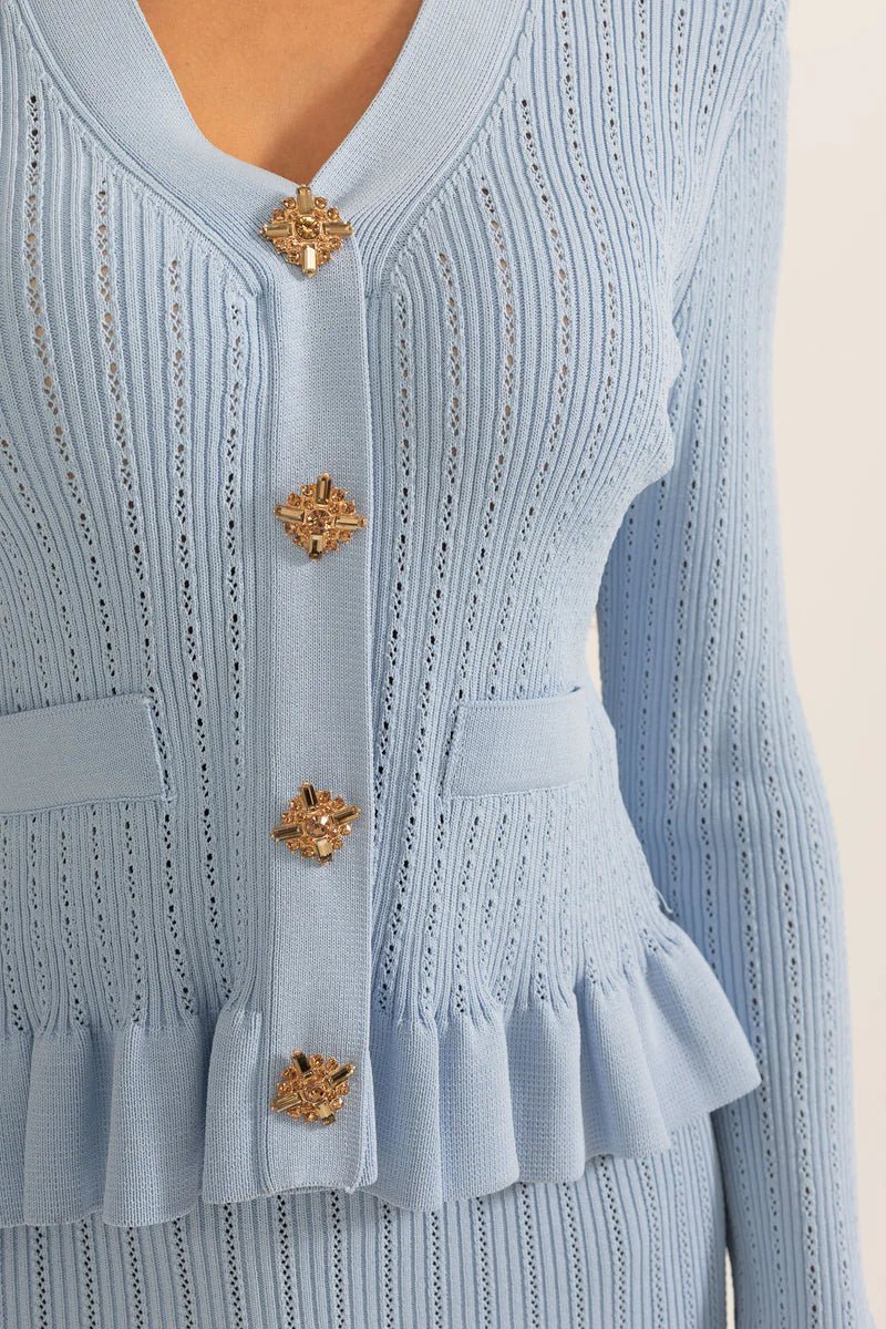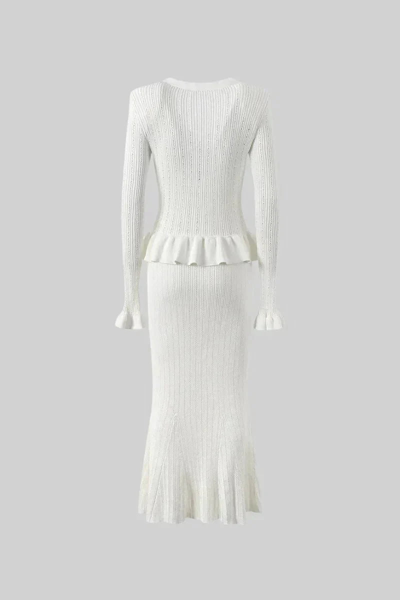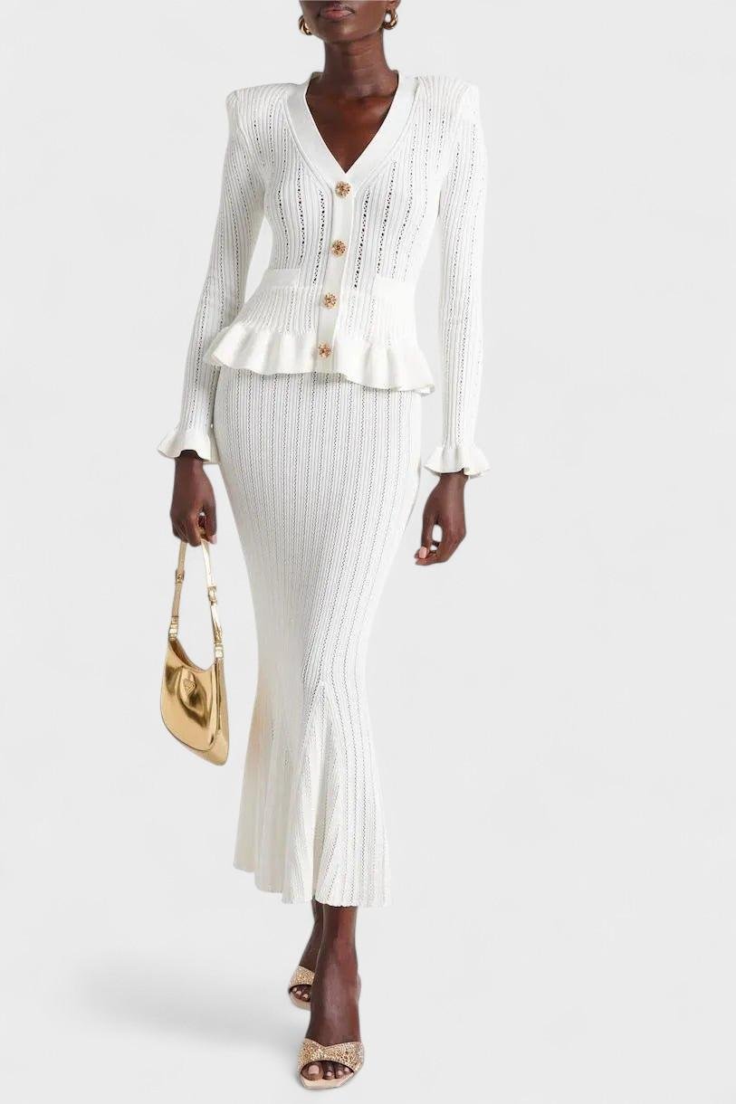 Prudence set je složen z dobře padnoucího svetrového kabátu s V-výstřihem, který má jemné volány na rukávech a vintage knoflíky, a z vysokého A-liniového midi sukně. Společně vytvářejí hladký a elegantní vzhled, který se snadno přenáší z ležérního stylu do chic outfitů.