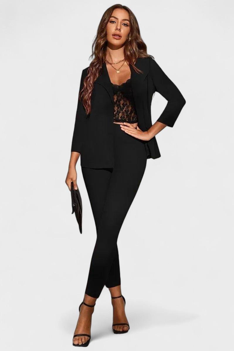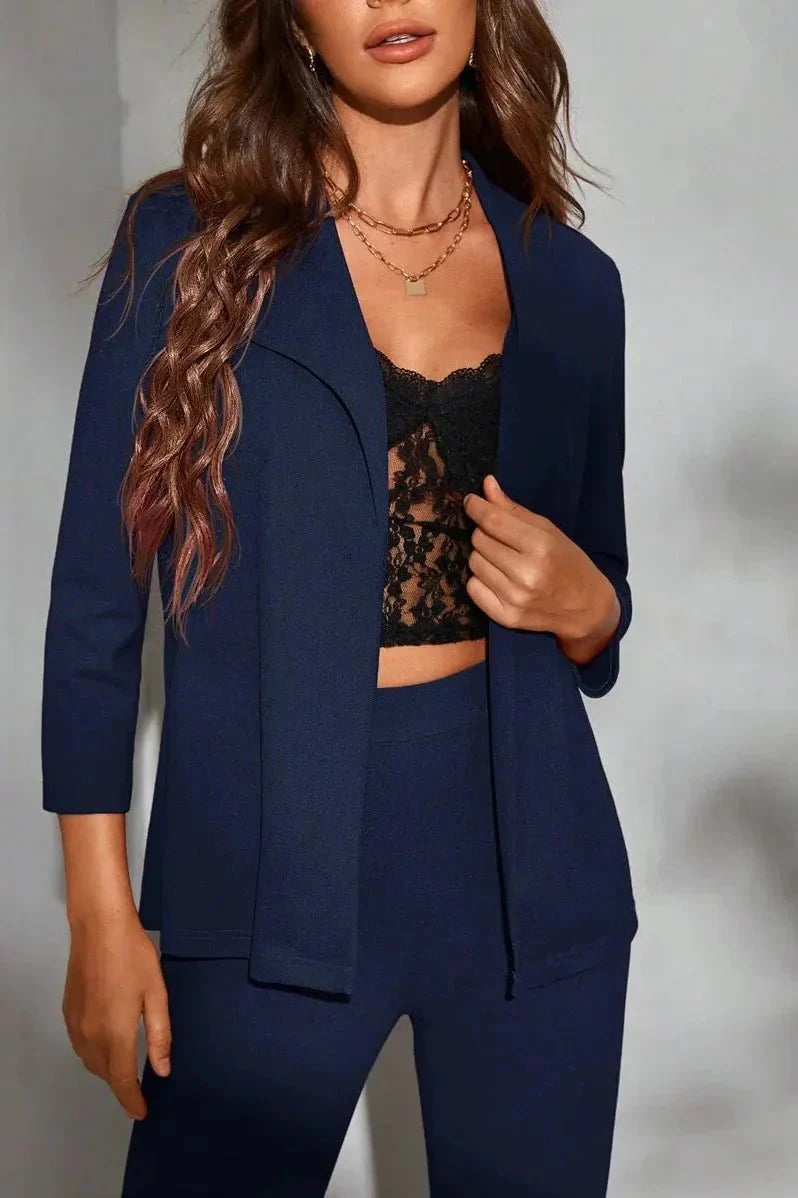 Mira-setti redefinuje profesionální eleganci moderním způsobem. Dlouhá asymetrická horní část se stylovými detaily na zip a ladící úzké kalhoty vytvářejí tmavě modrý celek, který vyzařuje styl, vznešenost a decentní šarm. Ideální pro chladnější období: Mira spojuje sofistikovaný vzhled s působivým designem — perfektní pro ženy, které chtějí udělat dojem, ale zároveň se pohybují s lehkostí.